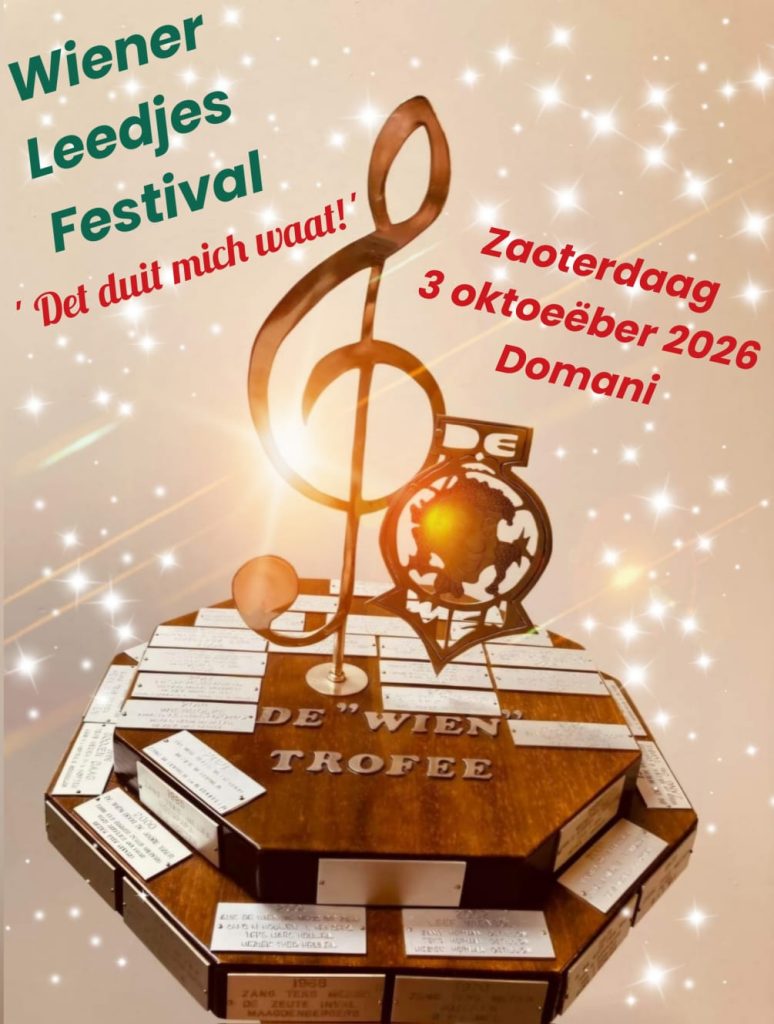 Zaoterdaag 3 oktoeëber 2026 zal weer ós jaorliks Wiener Leedjes Festival plaats vinde in Domani. Oet alle inzendinge waere door de vakzjurie, schrievers/komponistezjurie en zaalzjurie de 4 winnende