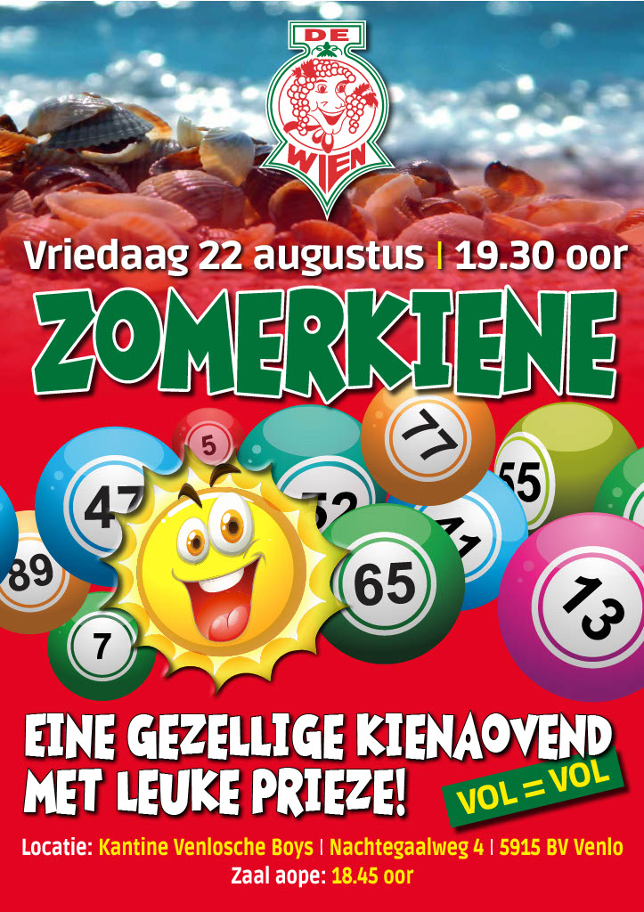 Vriedaag 22 augustus 2025 hilt Vastelaovesvereiniging De Wien waer ut jaorlijkse zomerkiene. Eine gezellige aovend met moeie prieze, dus trómmel óg femilie en vrinde op en kóm gezellig nao De kantine van de Venlosche Boys veur eine alderwets gezellige kienaovend.
